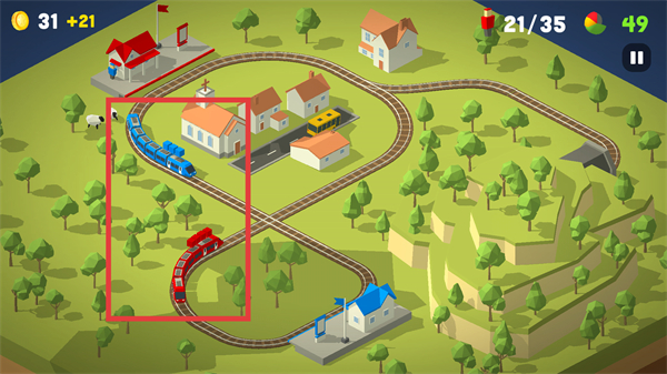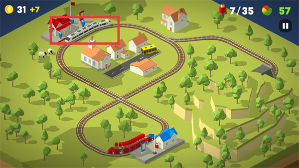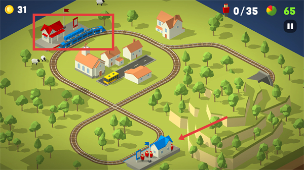 2、关注红框内的车站与蓝色火车,调整轨道方向,引导火车从该车站出发,沿轨道驶向下方站点,推进【0/35】进度。