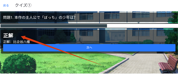 3、答对题目后,点击【次へ】继续下一题,不断积累正确答题数,提升游戏进度。