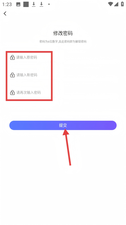 4、在修改密码页面,输入【请输入原密码】等信息后,点击【提交】按钮,可完成密码修改。