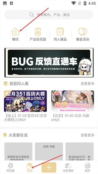 1、进入发现页面,点击顶部功能区的【粮坑】选项。