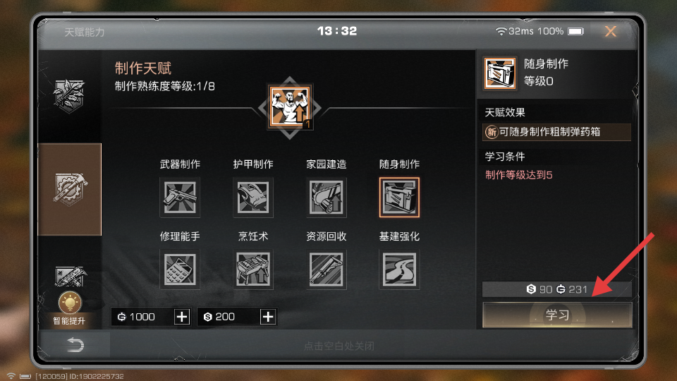 4、满足学习条件后,点击【学习】,完成天赋能力的学习提升。