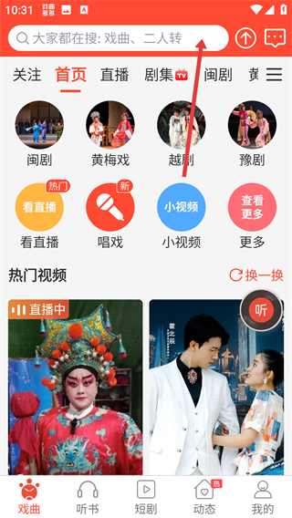 1、打开戏曲多多App,点击顶部【搜索栏】,准备输入想看的戏曲类型。