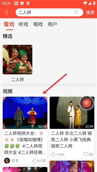 3、搜索结果出来后,在【视频】板块选择喜欢的二人转视频,点击即可开始观看呢。