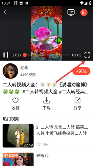 4、进入视频播放页后,点击右侧【全屏】按钮,能获得更佳观看体验,还可收藏、分享视频哦。