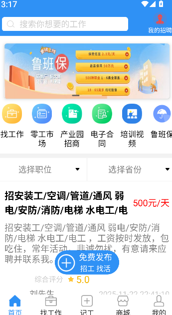1、进入首页后可查看项目资讯、岗位分类及推荐用工信息,确认需要进入的功能区域。