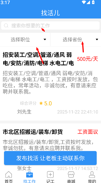 2、点击找工作板块,在搜索栏输入想要查找的岗位名称、职位类别、所在省份等条件进行筛选。