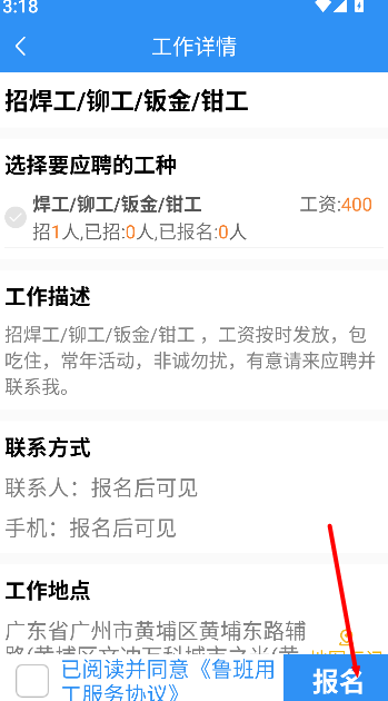 3、选择匹配的岗位后进入工作详情页面,查看工作要求与薪资说明,确认合适后点击报名即可完成操作。