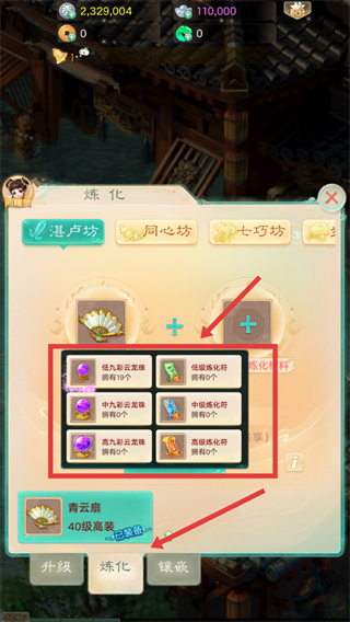 2、在炼化界面选择炼化材料,准备对装备进行炼化操作。
