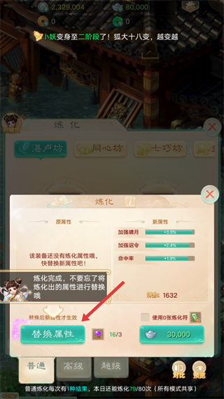 4、炼化完成后,点击【替换属性】,使新属性生效,提升装备的战力属性。