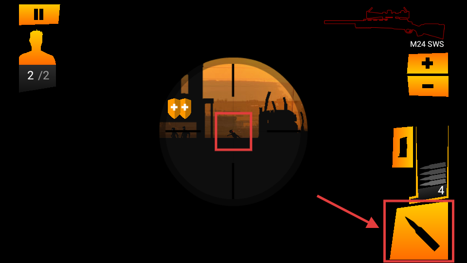 2、瞄准镜锁定僵尸后,点击弹药图标射击,关注弹药数量【4】,优先击杀靠近幸存者的僵尸,借助瞄准镜精准命中。