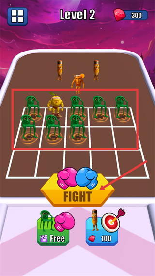 3、在战斗布局界面,将方框内相同等级的角色进行合成后,点击【FIGHT】发起对战,操控角色攻击敌方单位。