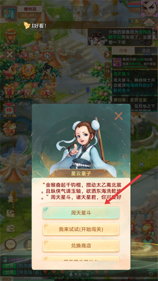 3、在周天星斗星阵界面,选择出战阵容后,点击【开始挑战】,进入关卡战斗。