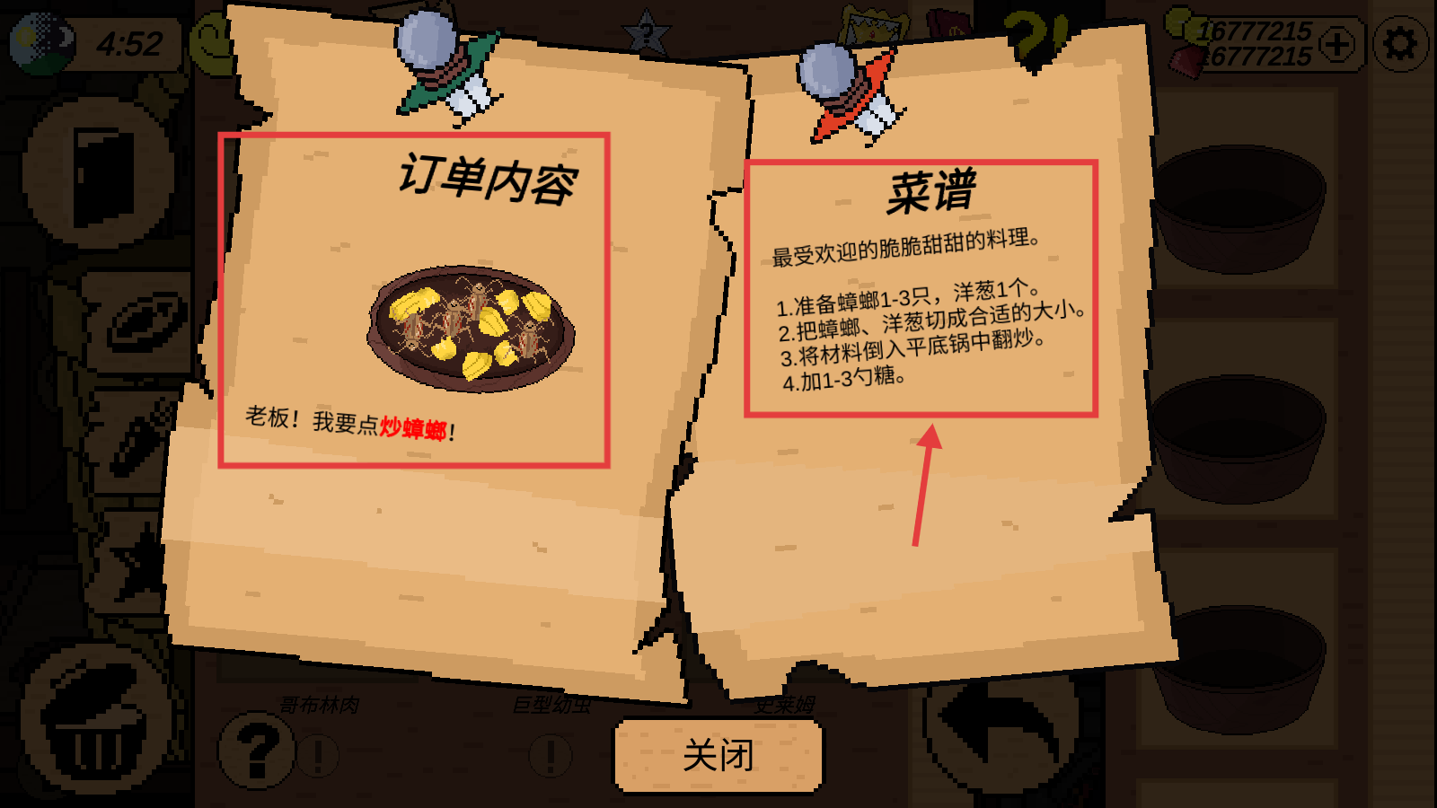 2、查看订单内容与菜谱,按步骤准备蟑螂和洋葱等食材,制作奇葩料理满足顾客需求。
