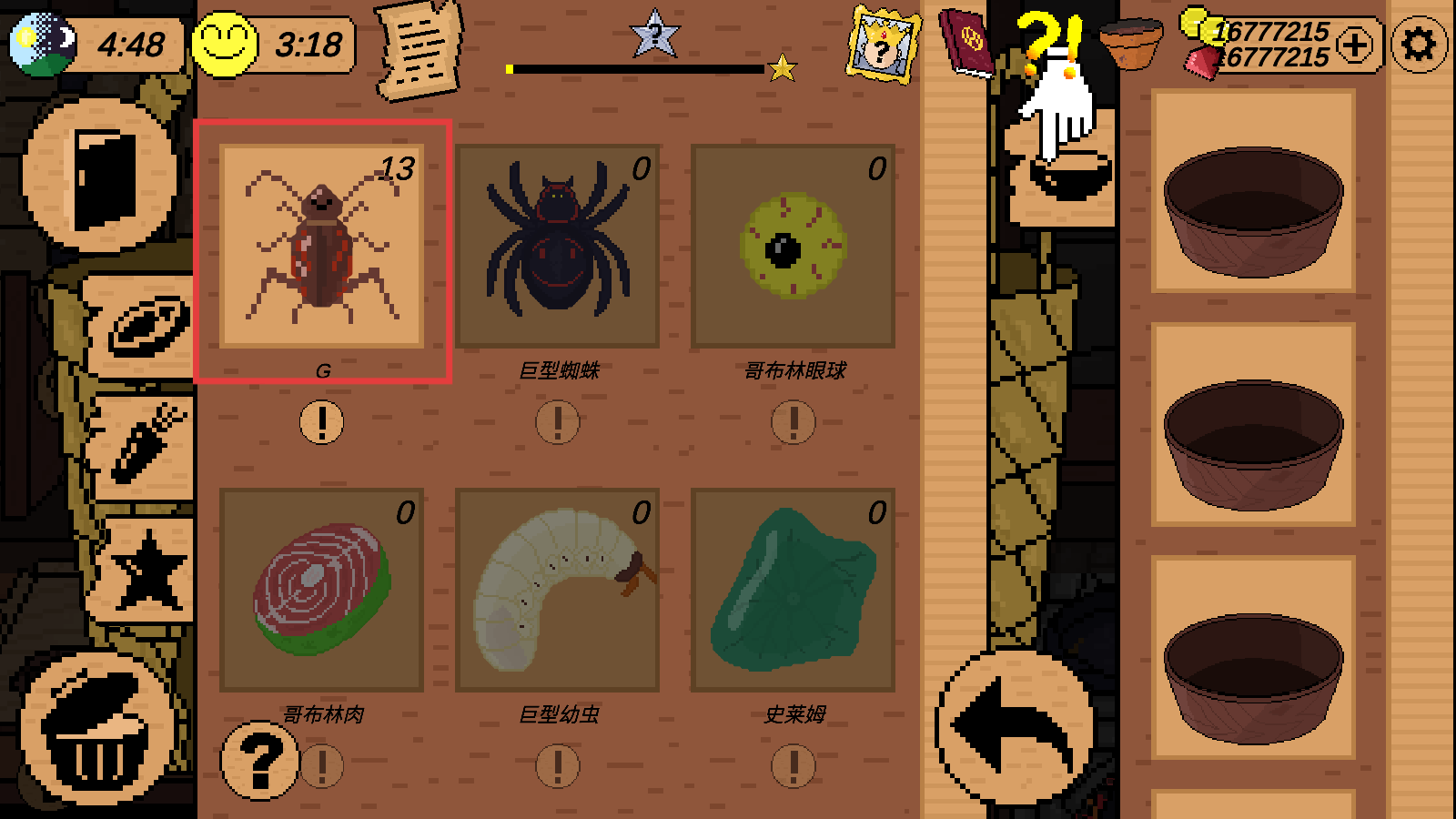 3、在食材界面查看蟑螂等原料数量,确保库存充足,为制作料理提供基础保障。