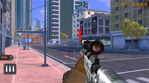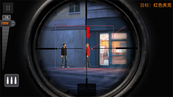 3、放大狙击镜倍数后,清晰识别出【红色夹克】目标,调整准星至目标核心区域,点击射击按钮完成精准打击。