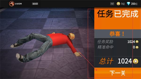4、任务完成后获取【1024】任务奖励,点击【下一关】进入新的狙击任务,继续以类似流程锁定并消灭指定目标。