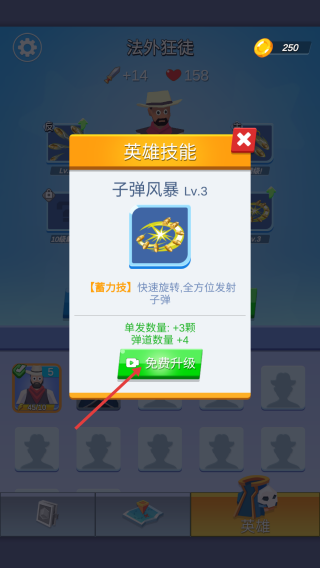 2、点击免费升级英雄技能,提升子弹风暴的单发数量和弹道数量,增强战斗能力。