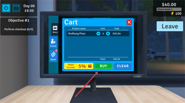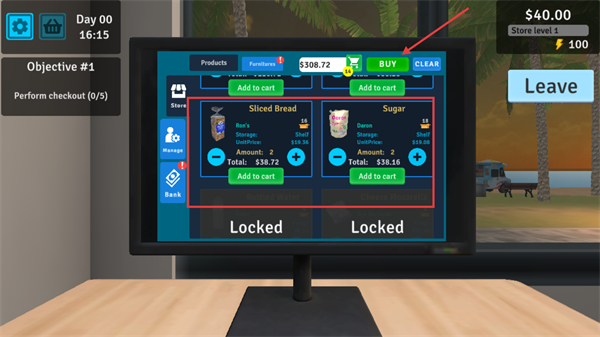 2、在电脑界面选择商品,添加到购物车,然后点击【BUY】完成商品采购,为商店备货。