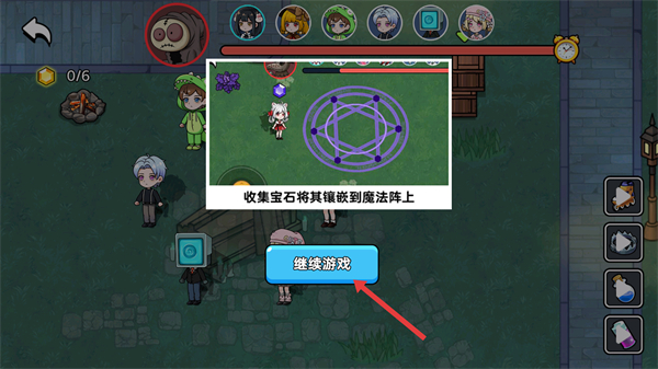 1、点击【继续游戏】按钮,进入游戏,明确需收集宝石镶嵌到魔法阵的任务目标。