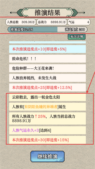 1、触发新事件时消耗【灵石】改善人族生存环境,可有效增加人族数量并推进推演进度。