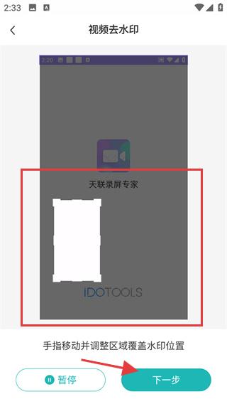 4、在编辑页移动区域覆盖水印位置,调整后点击【下一步】,完成去水印操作。