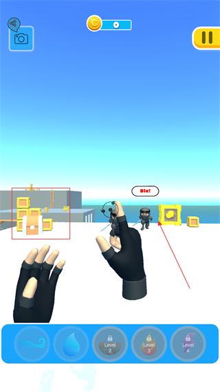 2、在关卡场景中,关注金币箱和敌人(如忍者),金币箱可提供货币资源,敌人需通过手势技能消灭。