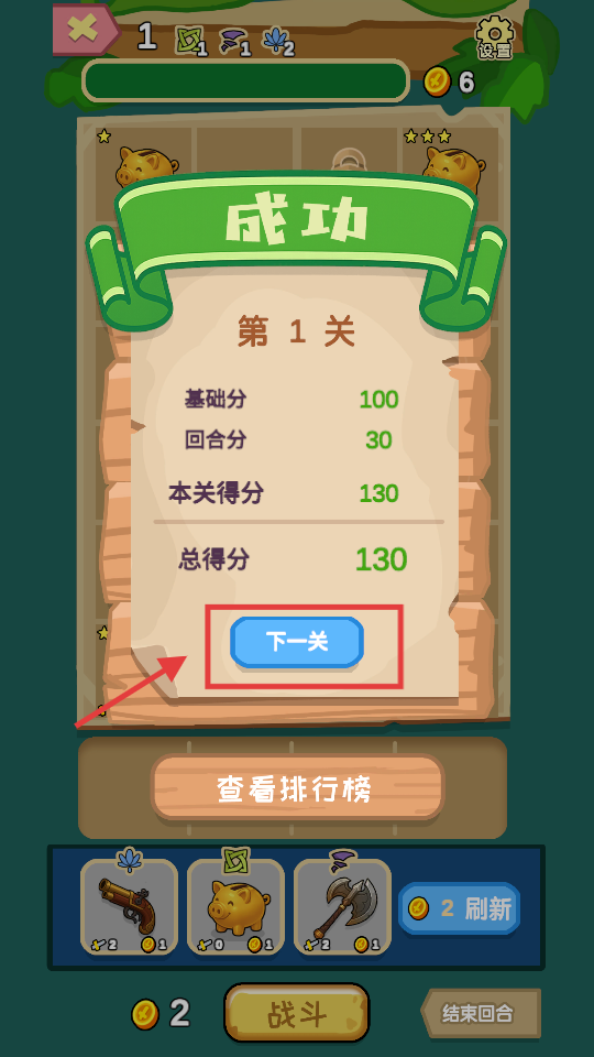 4、通关第【1】关,点击【下一关】继续挑战,积累得分,获更多装备。