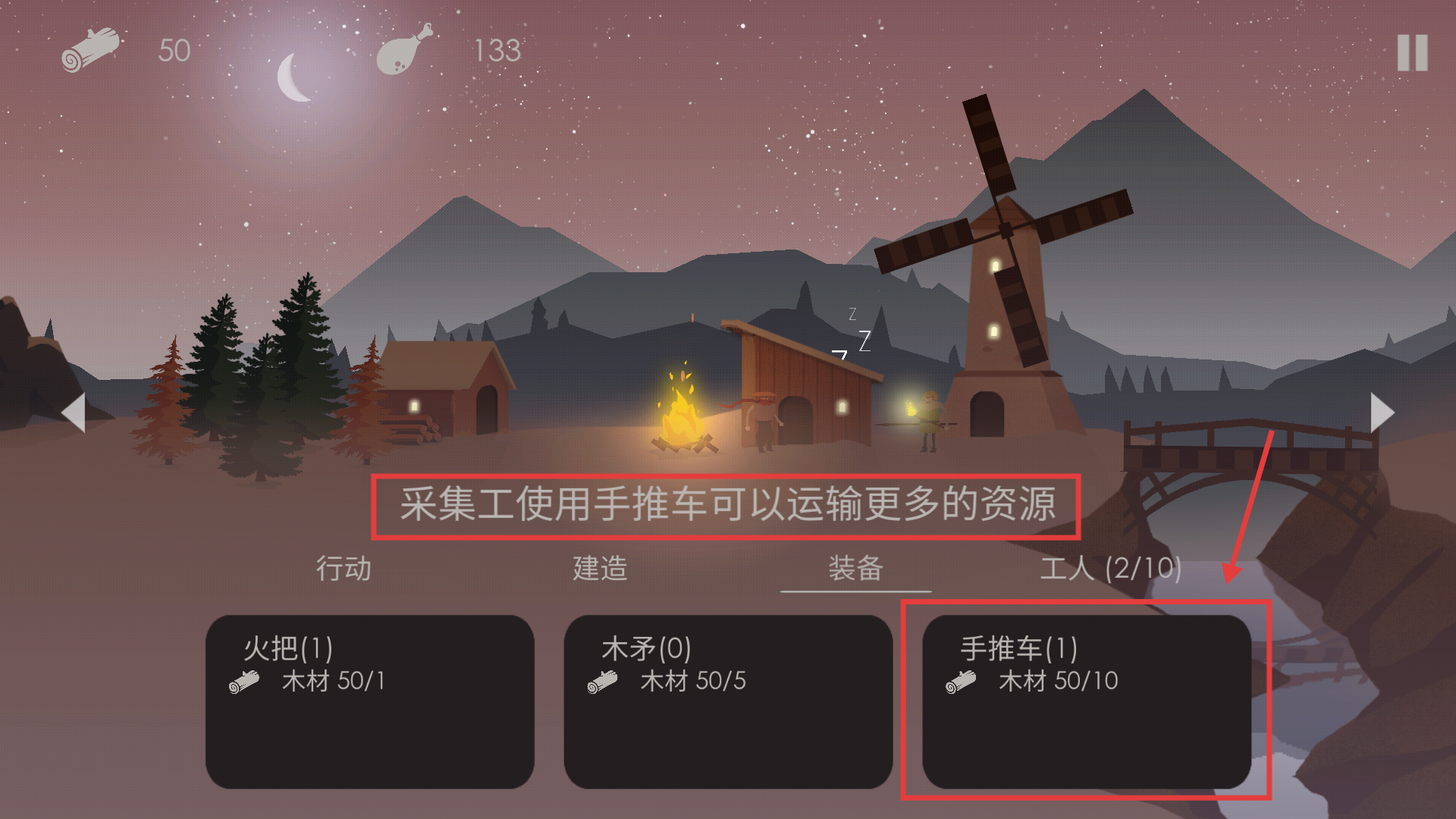 1、优先制作【手推车】,让采集工运输更多资源,提升早期资源收集效率,为后续建造打基础。