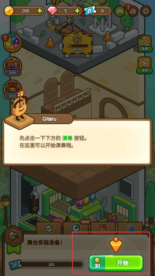 1、根据提示,点击下方绿色的【开始-按钮】(消耗30金币),开启演奏。