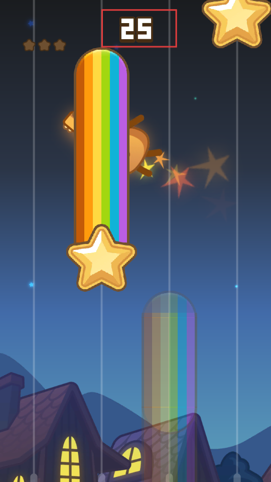 3、让吉他元素与彩虹色长条带星星区域互动,分数累计至【25】,触发更多星星效果。