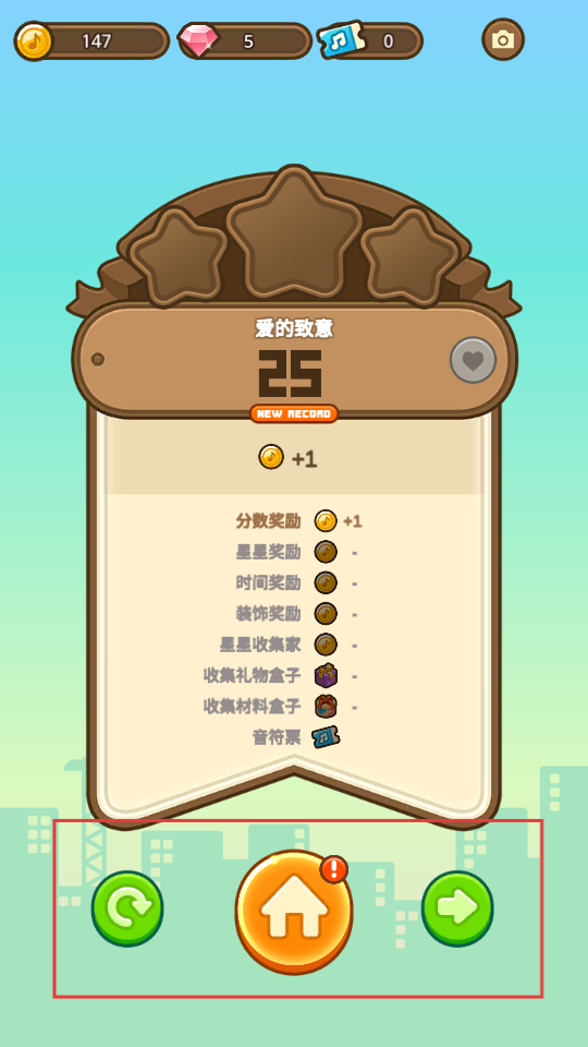 4、通关“爱的致意”关卡后,分数达【25-NEW-RECORD】,获取金币等奖励,可选择后续操作。