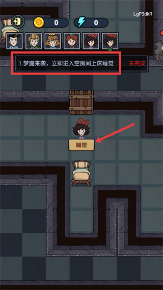 3、操控角色抵达房间后,点击【睡觉】按钮完成上床操作,推进红框内任务的完成进度。
