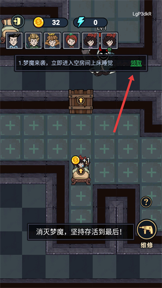 4、完成任务后点击【领取】获取奖励,积累【32-金币】,按提示准备消灭梦魇以持续存活。
