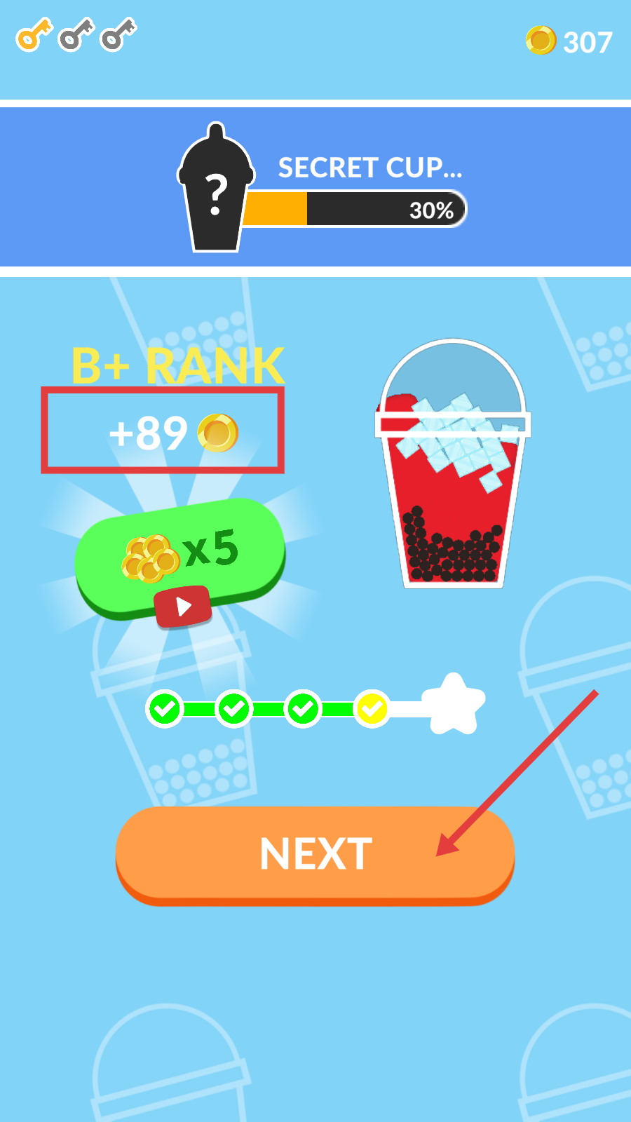 4、获得【+89金币】后点击【NEXT】进入下一关。