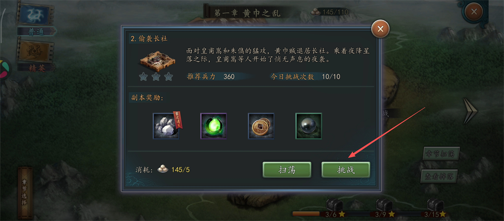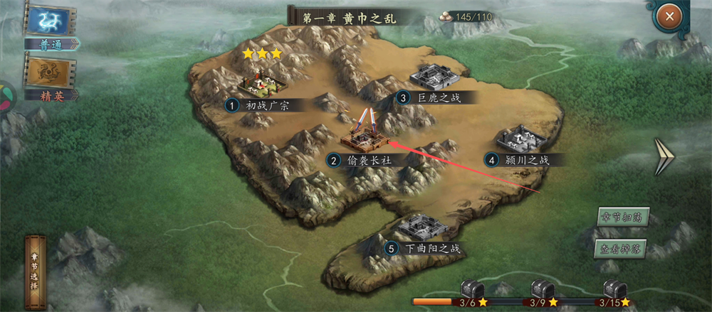 1、在关卡选择界面,选择【偷袭长社】关卡,按顺序推进战役,解锁后续剧情与资源获取点。