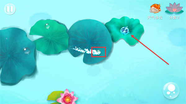 3、在游戏关卡内,操控露珠沿荷叶移动,收集目标元素(如气泡)以积累分数,推进关卡进度。