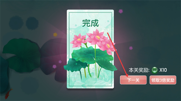 4、关卡完成后,在结算界面点击【下一关】按钮,可进入后续关卡,同时获取当前关的奖励(如10颗露珠)。