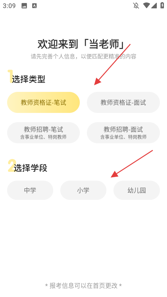 4、登录成功后,选择类型和学段,完成信息完善操作。