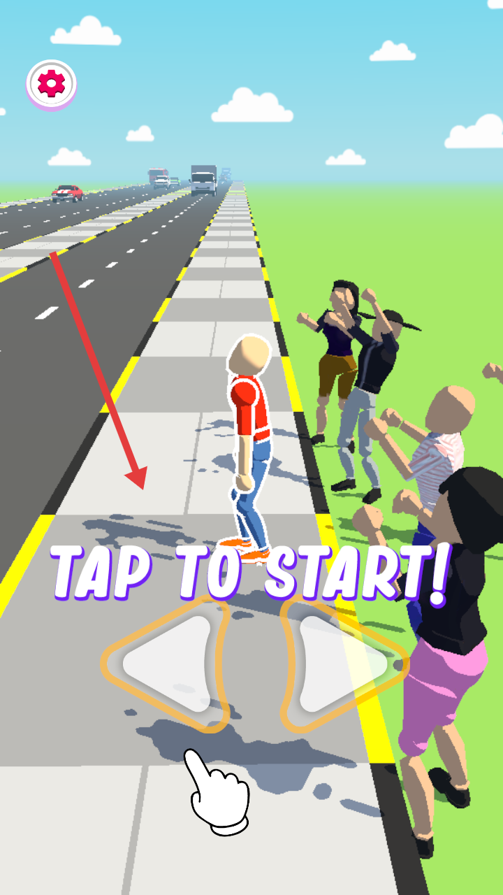 1、点击TAPTOSTART开始游戏,在公路场景中操控角色,开启穿越车流收集金币的挑战。
