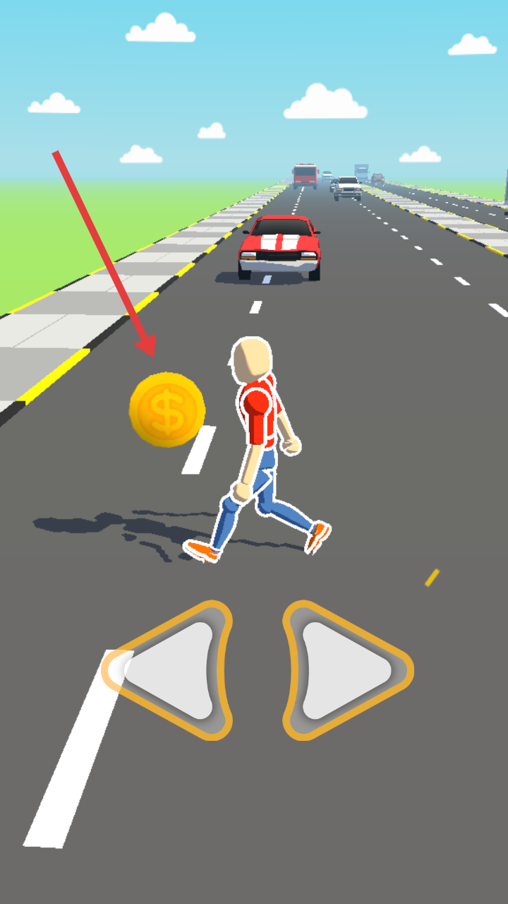 2、通过左右按键操控角色移动,躲避来往车辆,同时收集路上的金币,向终点推进。