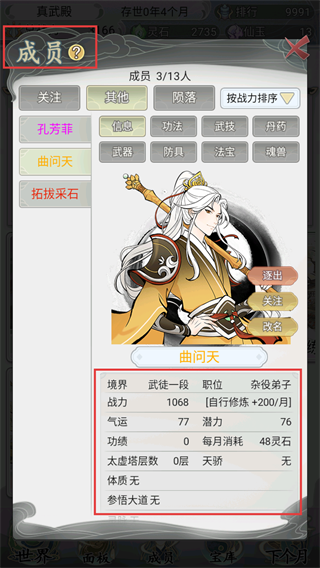 1、查看弟子【曲问天】的境界与气运等属性,合理安排其修炼任务,助力提升宗门整体战力。