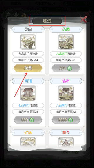 2、优先点击【灵田】的免费建造按钮获取资源,为后续门派建造药园或商铺积累基础。