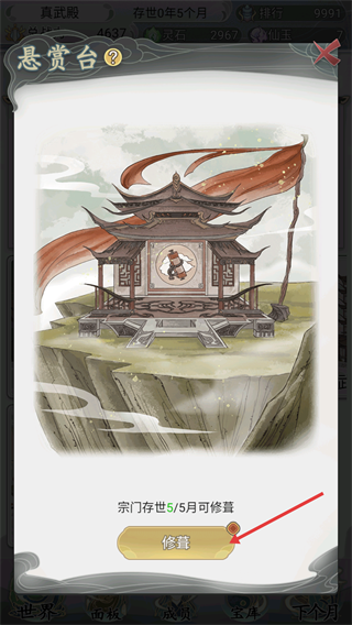 3、关注【悬赏台】的存续状态,及时点击修葺按钮,维持宗门正常运转避免中断发展。