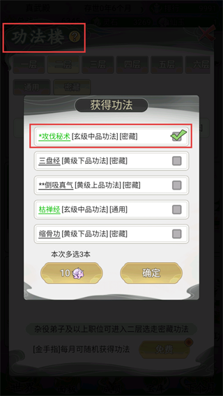 4、在【功法楼】选择【改骨经】等中级功法,点击确定按钮为弟子配备,增强其修炼效率。