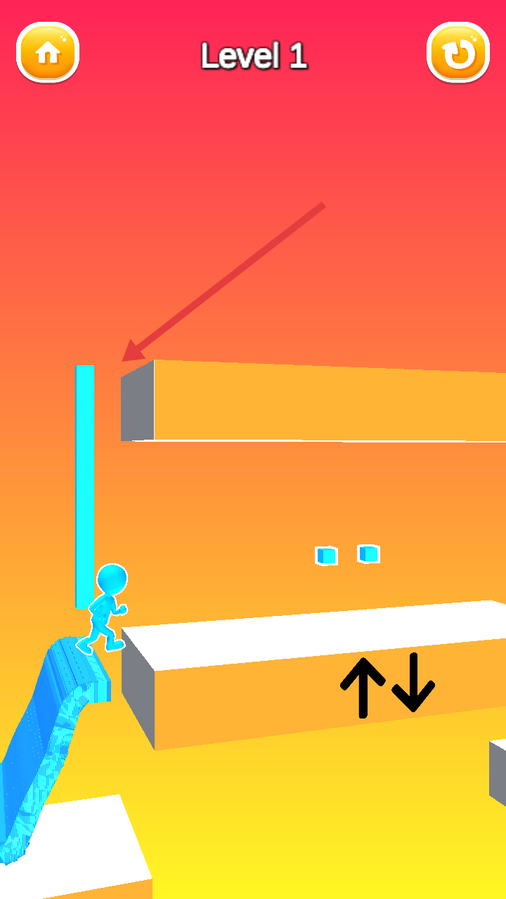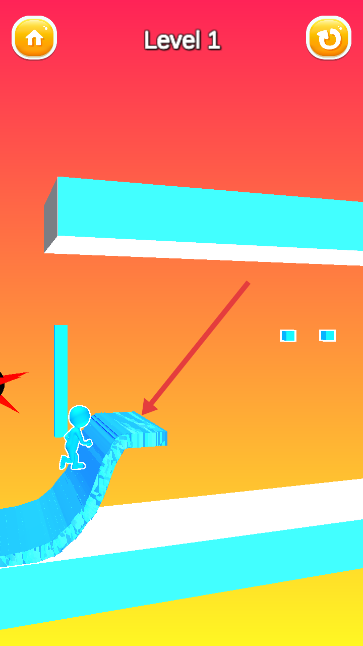 2、移动角色,利用蓝色坡道跳跃,躲避黑色尖刺等障碍,同时收集蓝色方块以构建路径。