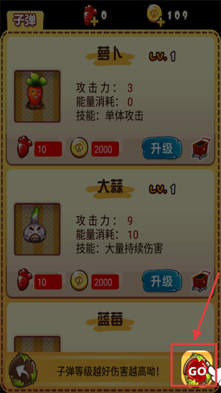 1、点击【GO】进入关卡,可携带【萝卜】【大蒜】等子弹植物,准备射击僵尸,提升伤害。