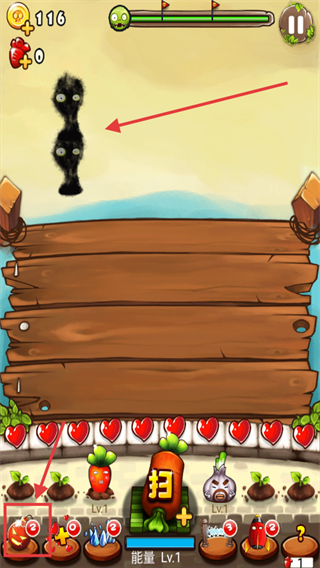 3、点击左下角【南瓜】道具(数量2),对僵尸等造成伤害,配合【萝卜】射击,快速清理敌人。