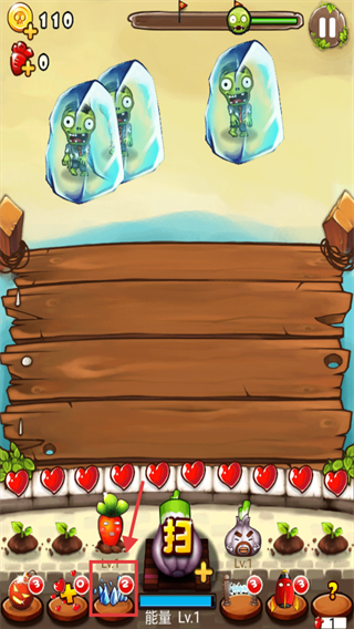 2、当僵尸出现时,点击【冰锥】道具(数量2)冰冻僵尸,配合【萝卜】-【大蒜】攻击,提升输出效率。