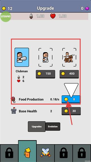 2、进入【Upgrade】界面,消耗金币升级【Food-Production】能提升资源获取效率,助力后续兵种解锁与属性强化。