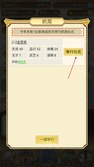 1、家族成员抓周时,查看【金楚离】的天资品行等属性,选择举行仪式可触发后续流程。